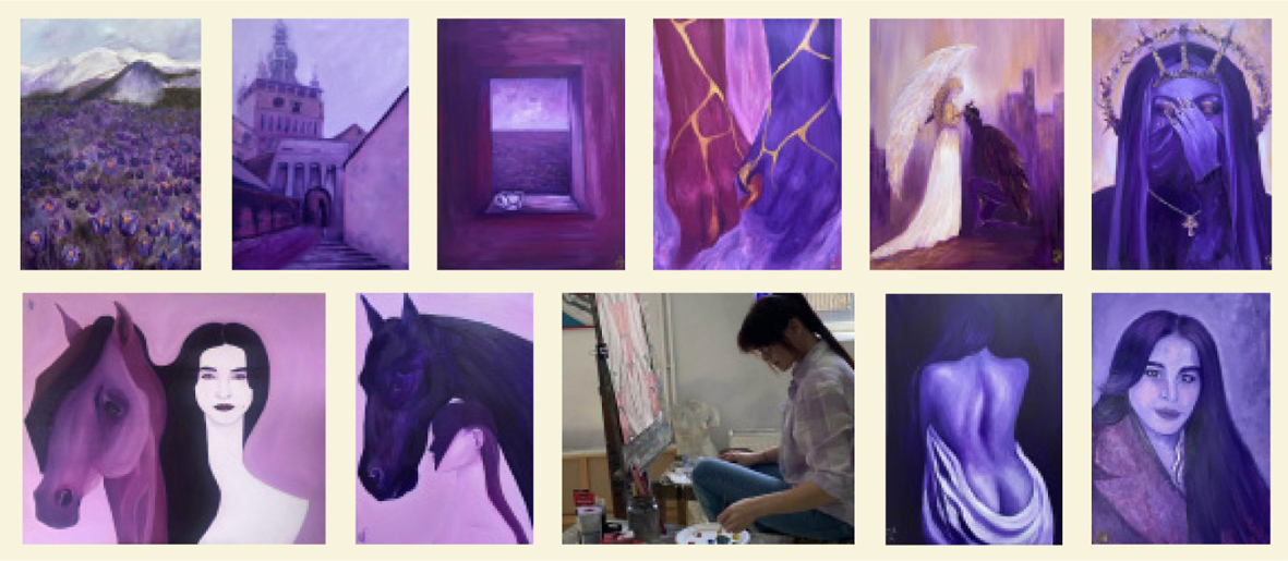 – Celor care mă urmăresc aş vrea, în primul rând, să le mulţumesc pentru că îmi sunt alături în parcursul meu şi să le amintesc că, denumirea paginii „My purples” se referă la emoţiile şi trăirile mele, pe care le-am îmbinat cu simbolistica culorii violet, nu este nimic superficial şi cu atât mai puţin frivol. Aş propune să nu mă urmărească doar din curiozitate, ci să înţeleagă dincolo de înţelesuri; ceea ce fac vine din suflet, cu suflet, pentru suflete, imperfecte ca mine şi mereu în căutare de frumos şi bun. Îmi doresc ca lucrările să fie văzute, iar mai apoi să-şi găsească poate un alt loc unde să dăinuiască la infinit.