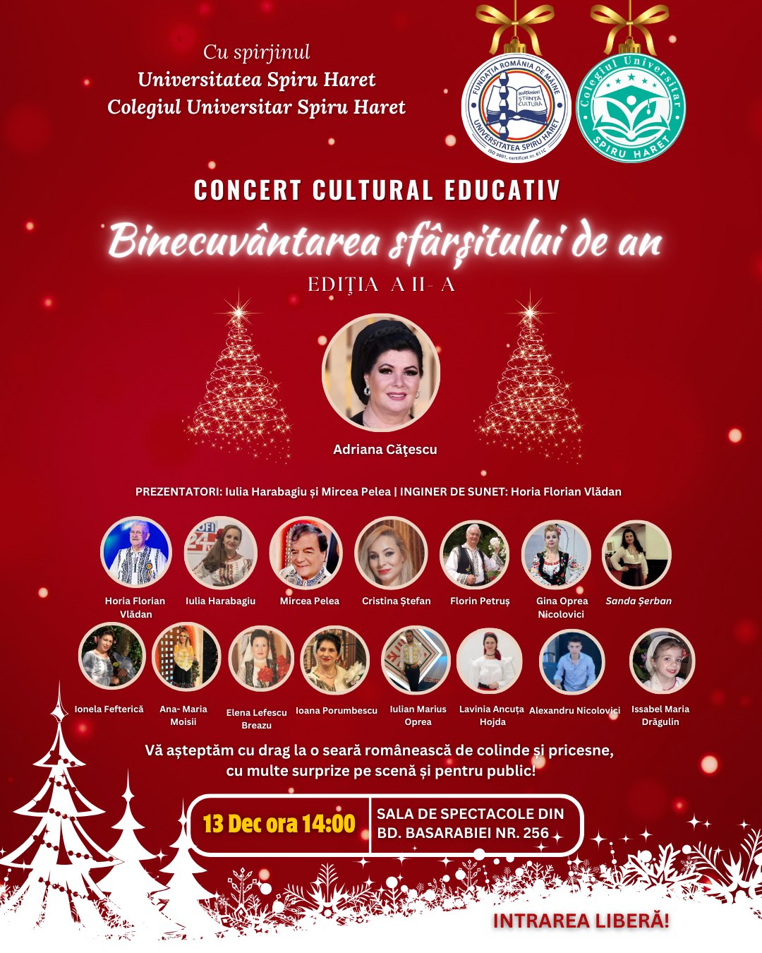 Universitatea „Spiru Haret” şi Colegiul Universitar „Spiru Haret”au organizat a doua ediţie a Concertului Cultural Educativ de sărbători „Binecuvântarea sfârşitului de an” dedicat tradiţiilor româneşti.