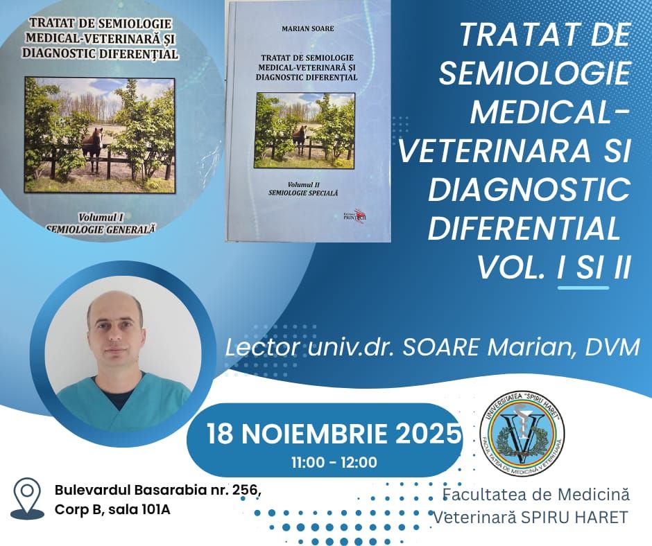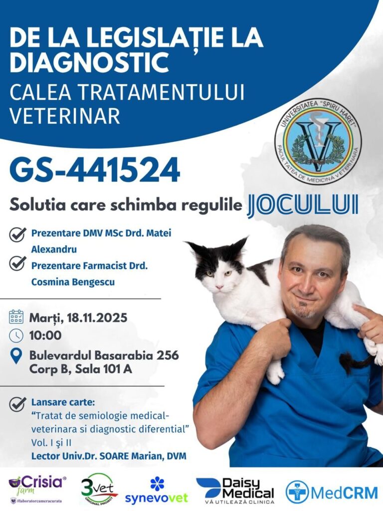 Marţi, 18 noiembrie, Facultatea de Medicină Veterinară – Universitatea SPIRU HARET găzduieşte un eveniment susţinut de DMV MSc Drd Matei Alexandru şi farmacist Drd. Cosmina Bengescu „De la legislaţie la diagnostic – Calea tratamentului veterinar” este un eveniment dedicat viitorilor medici veterinari, care îşi propune să conecteze teoria cu practica. Participanţii vor descoperi cum legislaţia, laboratorul, diagnosticul şi tratamentul se împletesc într-un proces unitar, ghidat de responsabilitate şi pasiune pentru profesie.