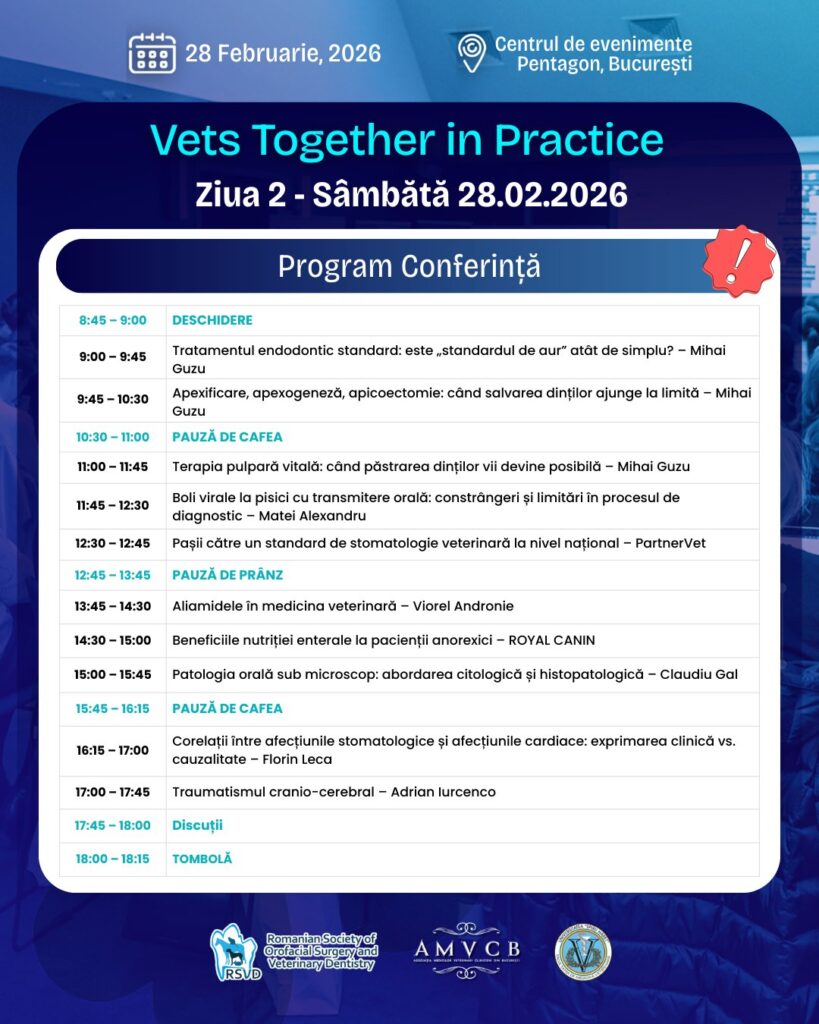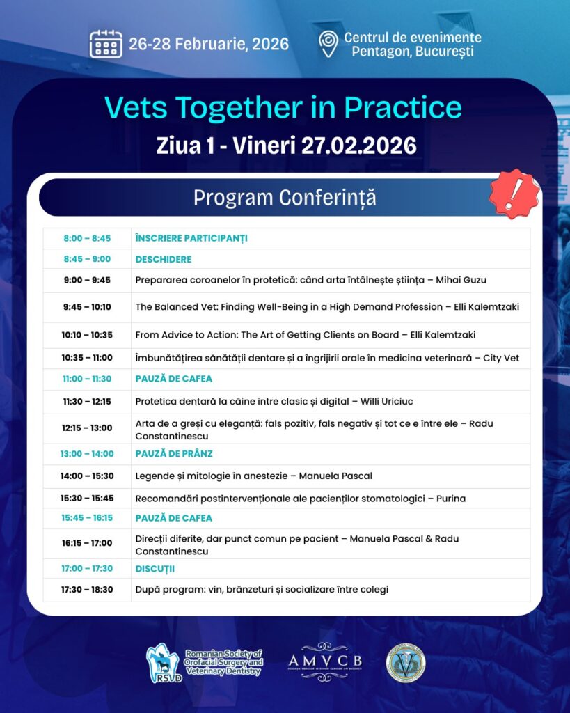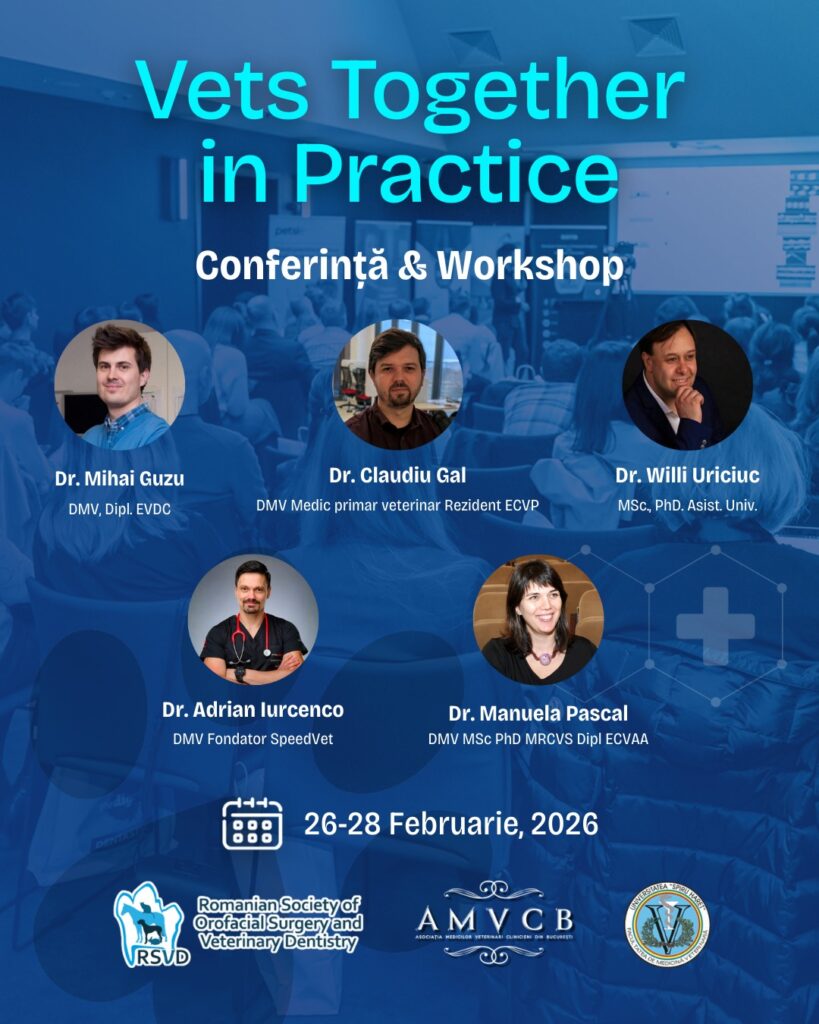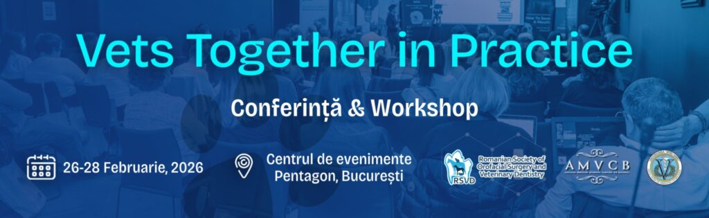 Societatea Română de Chirurgie Orofacială şi Stomatologie Veterinară (RSVD), în parteneriat cu Asociaţia Medicilor Veterinari Clinicieni din Bucureşti şi Facultatea de Medicină Veterinară din cadrul Universităţii „Spiru Haret” organizează la Bucureşti, în perioada 26–28 februarie 2026, un eveniment exclusiv dedicat profesioniştilor veterinari pasionaţi de avansarea expertizei lor în stomatologia veterinară, medici veterinari şi studenţi, ediţia a 4-a a Conferinţei de Stomatologie Veterinară – Vets Together in Practice.