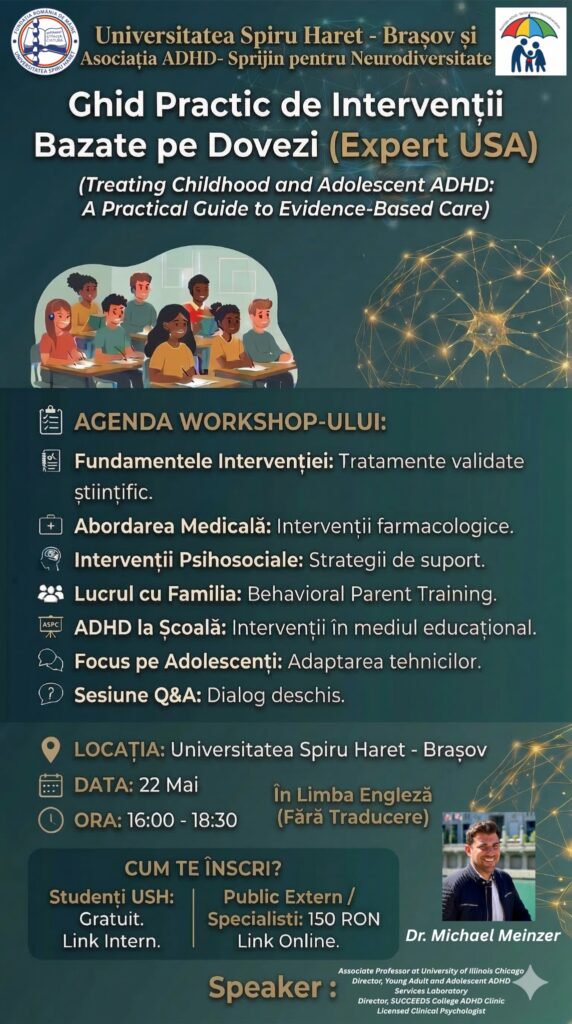 Asociaţia ADHD – Sprijin pentru Neurodiversitate, în parteneriat cu Universitatea Spiru Haret, Braşov, te invită pe data de 22 Mai, de la ora 16:00, la un workshop Internaţional ADHD de excepţie susţinut de invitatul special: dr. Michael Meinzer, Associate Professor în cadrul Departamentului de Psihologie şi Director al YAAAS Lab (Young Adult and Adolescent ADHD Services) la UIC (University of Illinois Chicago), expert de renume oferind o perspectivă modernă şi aplicată asupra tratamentului ADHD la copii şi adolescenţi.