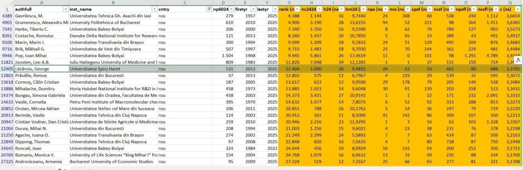Conf. univ. dr. habil. George Lăzăroiu (Facultatea de Ştiinţe Economice Bucureşti a Universităţii „Spiru Haret”) a fost inclus, pentru al 6-lea an la rând, în clasamentul celor mai citaţi autori din lume, clasament realizat de către Universitatea Stanford. Există 8,8 milioane de oameni de ştiinţă în lume. Topul include primele 100.000 de persoane. Conf. univ. dr. habil. George Lăzăroiu este pe poziţia 12.405 ca impact. (https://elsevier.digitalcommonsdata.com/data…/btchxktzyw/8)
