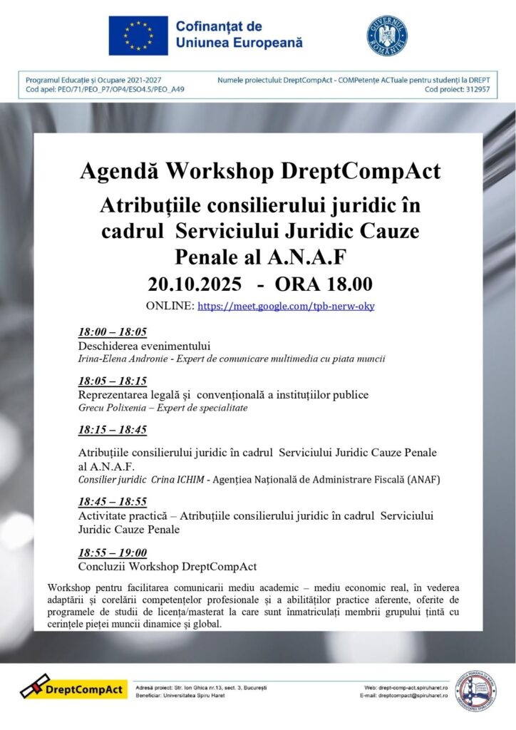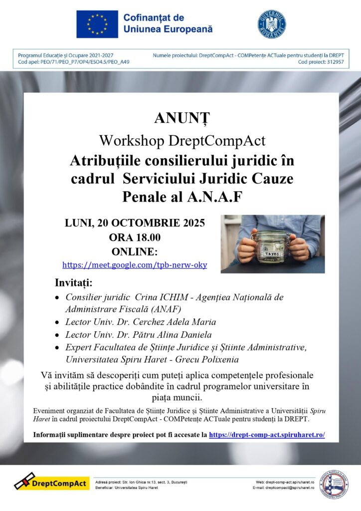 Luni, 20 octombrie 2025, a fost organizat online, în cadrul proiectului DreptCompAct, un nou eveniment interactiv care a adus împreună studenţi, cadre didactice şi specialişti din mediul juridic şi economic real cu tema: „Atribuţiile consilierului juridic în cadrul Serviciului Juridic Cauze Penale al A.N.A.F.”