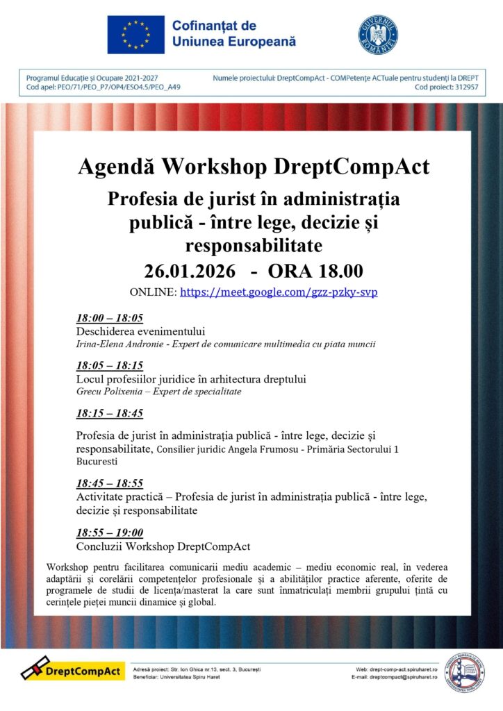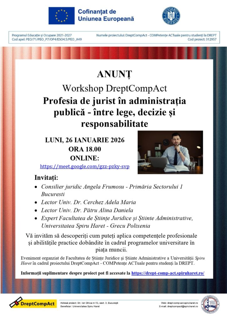 Studenţii Facultăţii de Ştiinţe Juridice şi Ştiinţe Administrative Bucureşti – Universitatea „Spiru Haret” au fost invitaţi luni, 26 ianuarie 2026, de la ora 18:00, la un nou workshop* online din seria „DreptCompAct” cu tema: „Profesia de jurist în administraţia publică – între lege, decizie şi responsabilitate”.