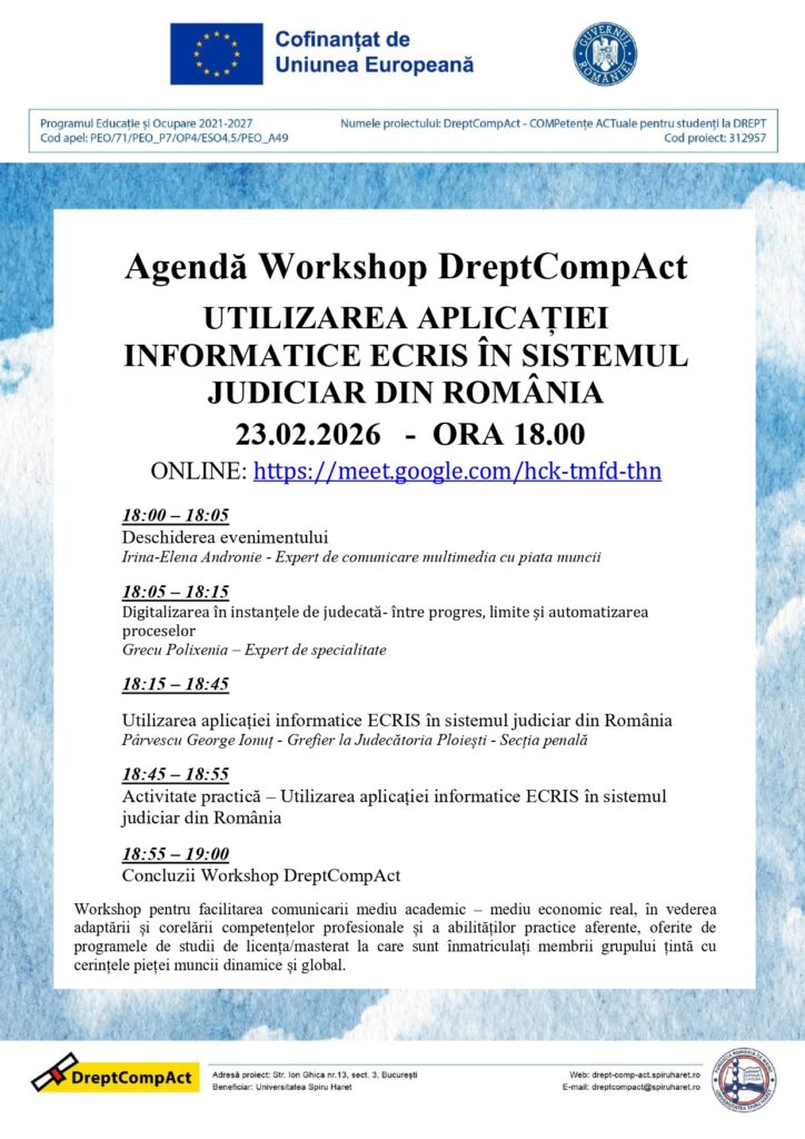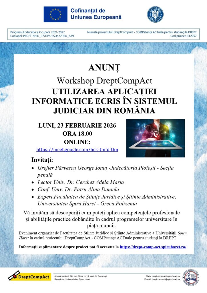 În cadrul proiectului DreptCompAct, finanţat din fonduri europene, Facultatea de Ştiinţe Juridice şi Ştiinţe Administrative – Universitatea „Spiru Haret” continuă seria evenimentelor dedicate conectării reale dintre mediul academic şi practica profesională.