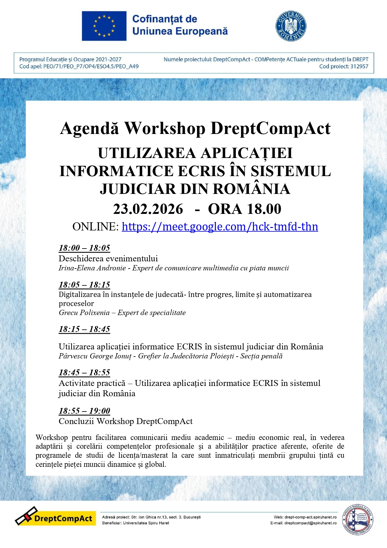 Workshop-ul face parte din activitatea A.2.1.A a proiectului „DreptCompAct”, dedicată dezvoltării de parteneriate sustenabile cu angajatori şi instituţii relevante pentru pregătirea practică a studenţilor.