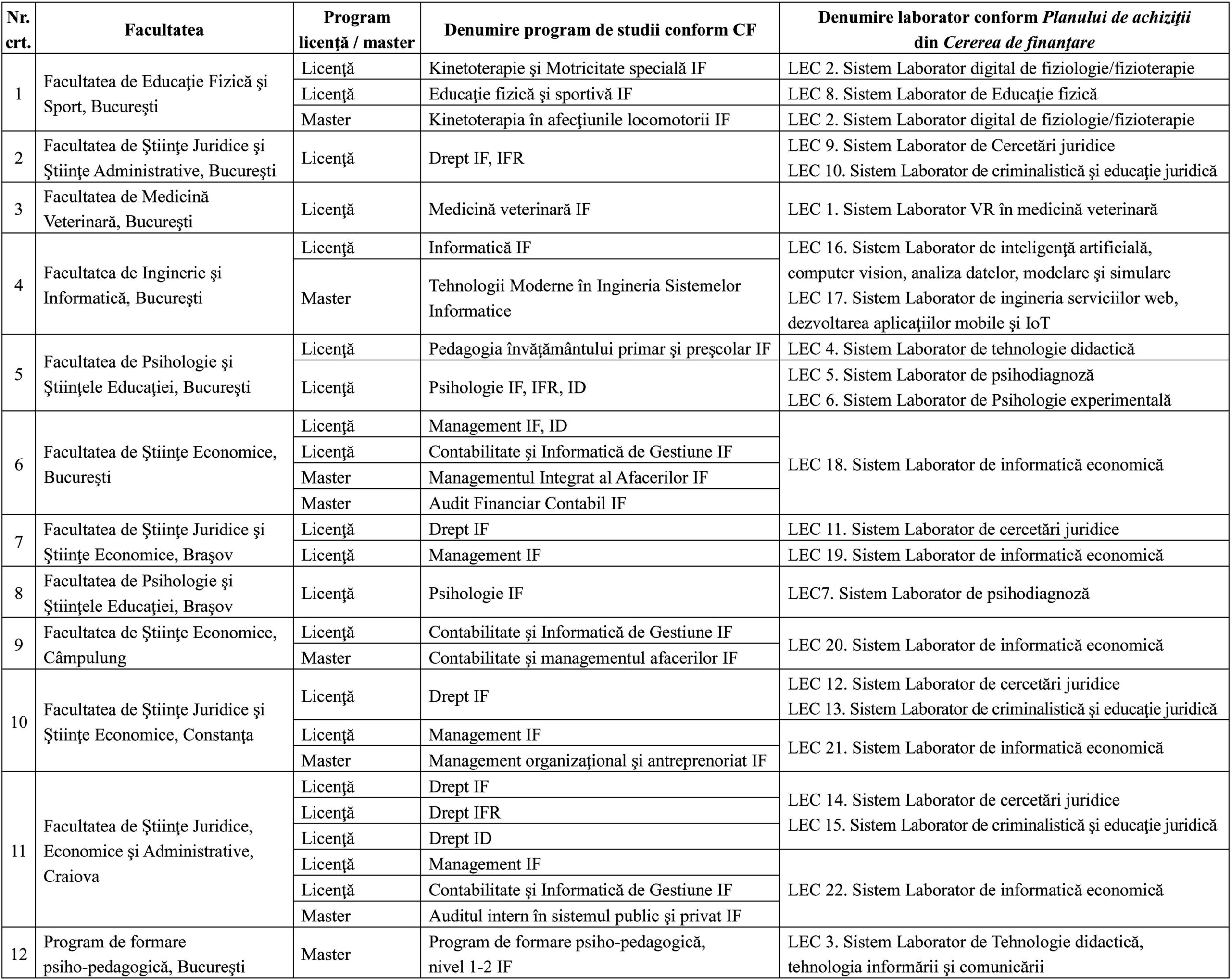 Totodată, cadrele didactice, secretarele şi bibliotecarele implicate în organizarea/desfăşurarea activităţilor programate în laboratoarele modernizate prin proiect (aferente disciplinelor din planurile de învăţământ specifice programelor de studii vizate) au participat la stagii de instruire privind utilizarea sistemelor/echipamentelor digitale nou achiziţionate, realizate de furnizori, în colaborare cu specialiştii Direcţiei IT, pe durata instalării/punerii în funcţiune/configurării acestora la sediile facultăţilor/altor structuri organizatorice/funcţionale din universitate pentru care au fost achiziţionate.