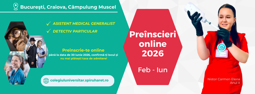 Până pe 30 iunie, Colegiul Universitar „Spiru Haret” organizează preînscrieri online pentru calificările profesionale: Asistent Medical Generalist şi Detectiv Particular în cele trei centre din: Bucureşti, Craiova şi Câmpulung Muscel.