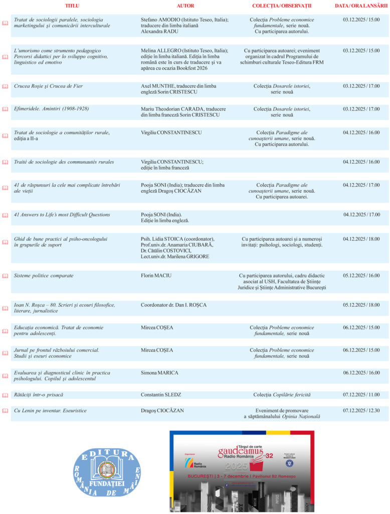 Lansări de carte la Târgul internaţional Gaudeamus-Radio România 2025, ROMEXPO, Pavilion B2